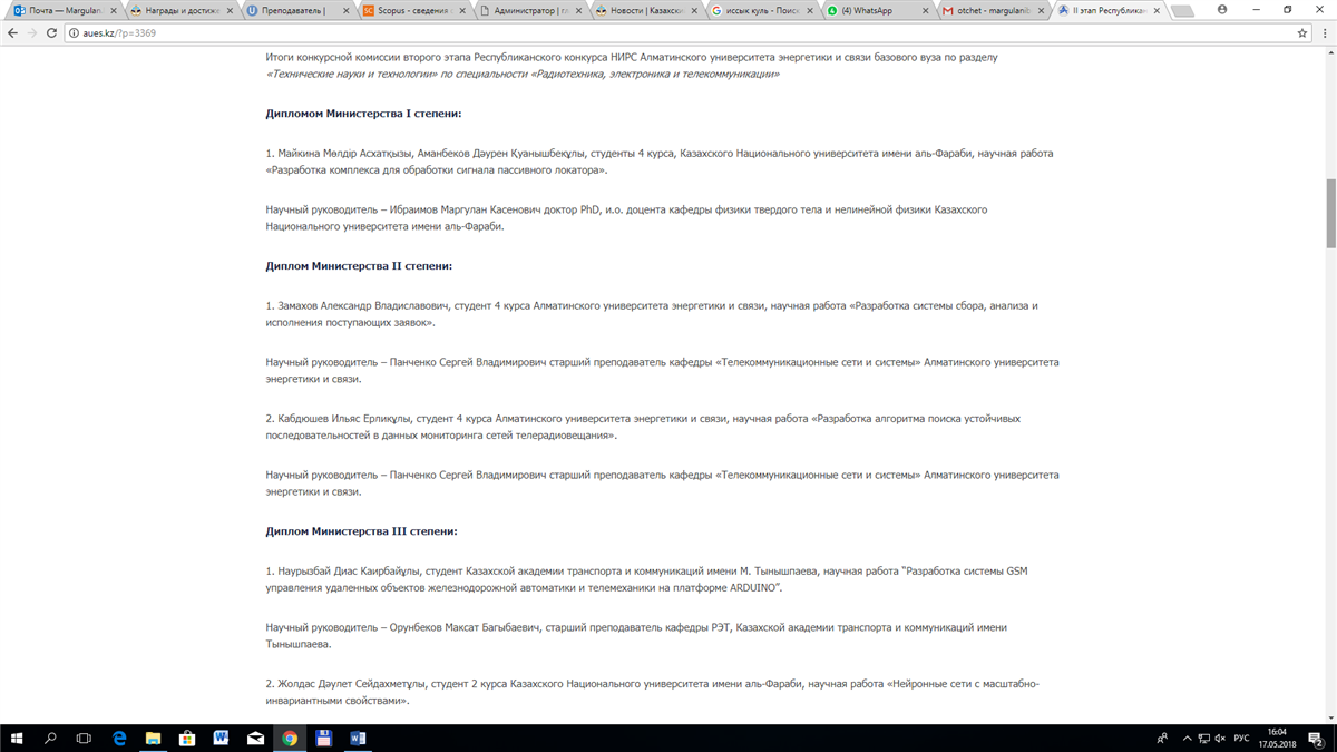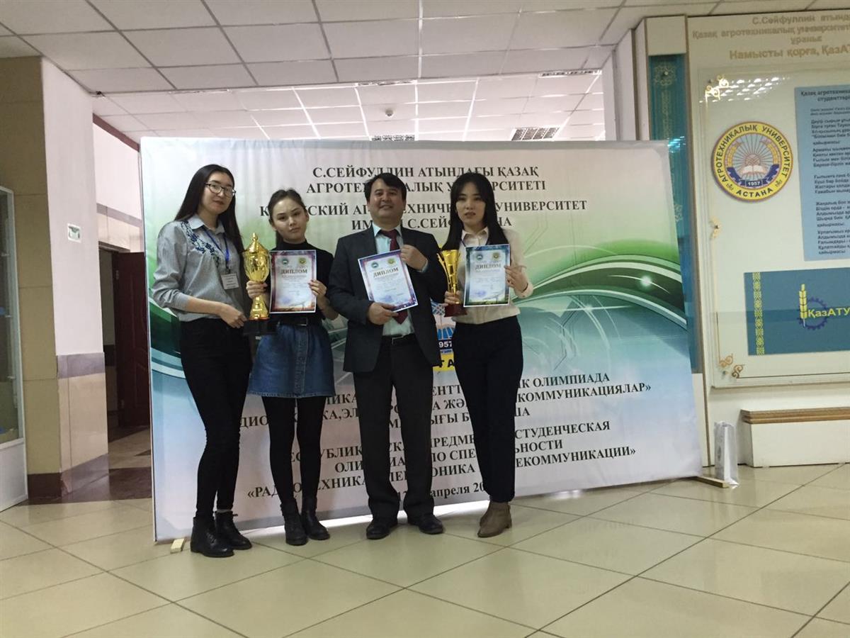 13.05.2018Аманкулов Даурен и Майкина Молдир, студенты 4 курса по специальности «5В071900 - Радиотехника, электроника и телекоммуникации» - 1 место (Диплом Министерства I степени) в Республиканском конкурсе научно-исследовательских работ студентов на базе Алматинского университета энергетики и связи по разделу «Технические науки и технологии». Научным руководителем студентов является PhD - Ибраимов Маргулан Касенович.