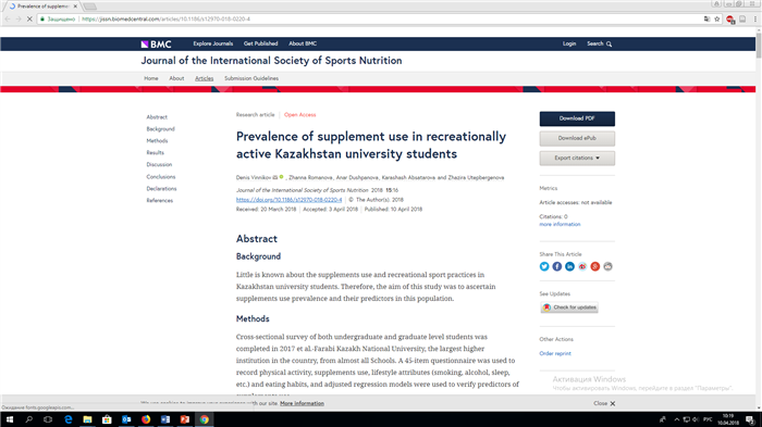 2. Статья в международном рецензируемом журнале «Journal of the International Society of Sports Nutrition». Prevalence of supplement use in recreationally active Kazakhstan university students». SJR-0.574, IF-2.06.