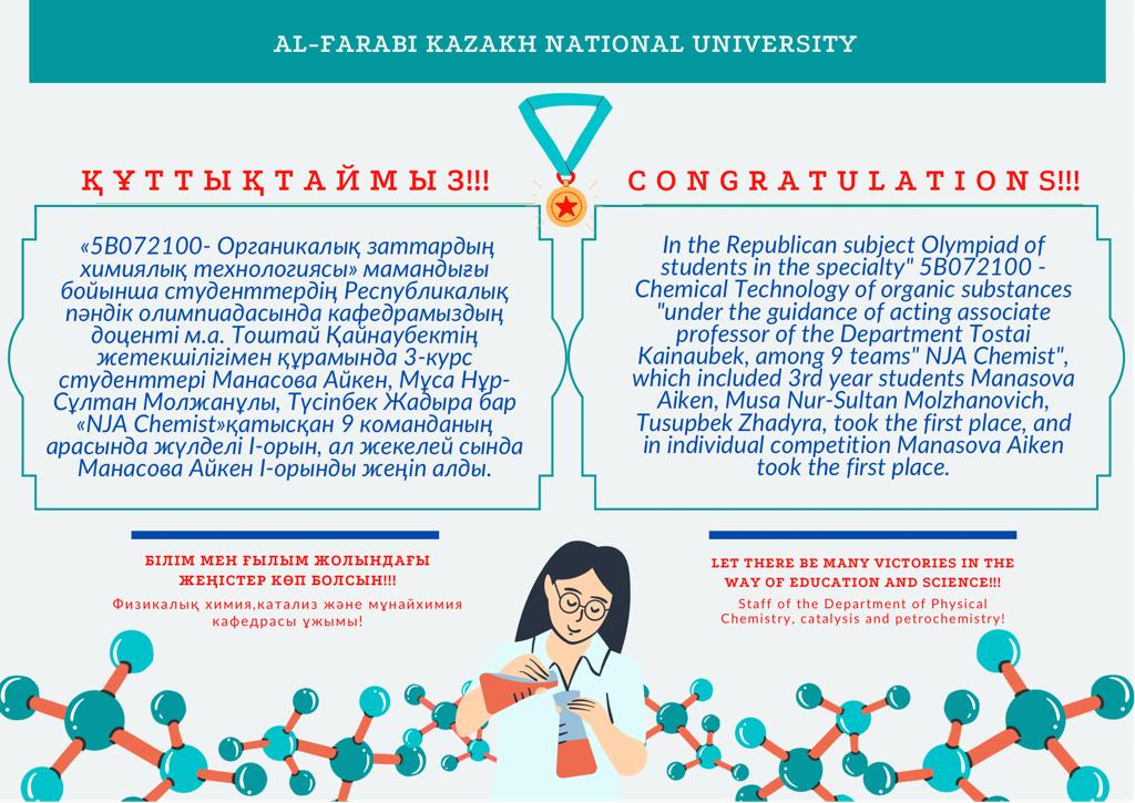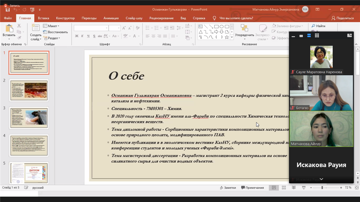 В рамках программы педагогической практики докторантов первого курса специальности «Нефтехимия» КазНУ им. аль-Фараби в онлайн формате на платформе Zoоm 01.04.2022 г. было проведено профориентационное мероприятие «День открытых дверей факультета химии и химической технологии КазНУ им. аль-Фараби» для учащихся 11-го класса лицея №92 им. М. Ганди. Спикерами выступили докторанты кафедры физической химии, катализа и нефтехимии Абдрасилова А., Асылбеков Е., Попов Н., Шоганбек Д. и Жылкыбек М. В мероприятии приняли участие директор лицея Шажабаева К.С., Ph.D ст.преподаватель Супиева Ж.А., руководитель педпрактики доцент Ташмухамбетова Ж.Х., учащиеся и преподаватели лицея. Мероприятие проводилось через использование информативной презентации с познавательными и интерактивными элементами. Особый интерес у школьников вызвал экскурс в историю развития химии как науки, с переходом к существующим способам химических производств, обсуждены вопросы, касающиеся роли химии и нефтехимии в повседневной жизни. Особое внимание было уделено месту нефтехимии в индустриализации, необходимости развития нефтяной отрасли и востребованности специалистов химиков и нефтехимиков. Вниманию аудитории была предложена информация об университете и факультете химии и химической технологии, их достижениях в мировых рейтингах университетов, об образовательных программах, реализуемых факультетом, о возможностях, предоставляемых вузом, таких как, обучение по двудипломным программам в зарубежных вузах-партнерах, прохождение практик в многочисленных НИИ и других преимуществах обучения на факультете химии и химической технологии КазНУ им. аль-Фараби.