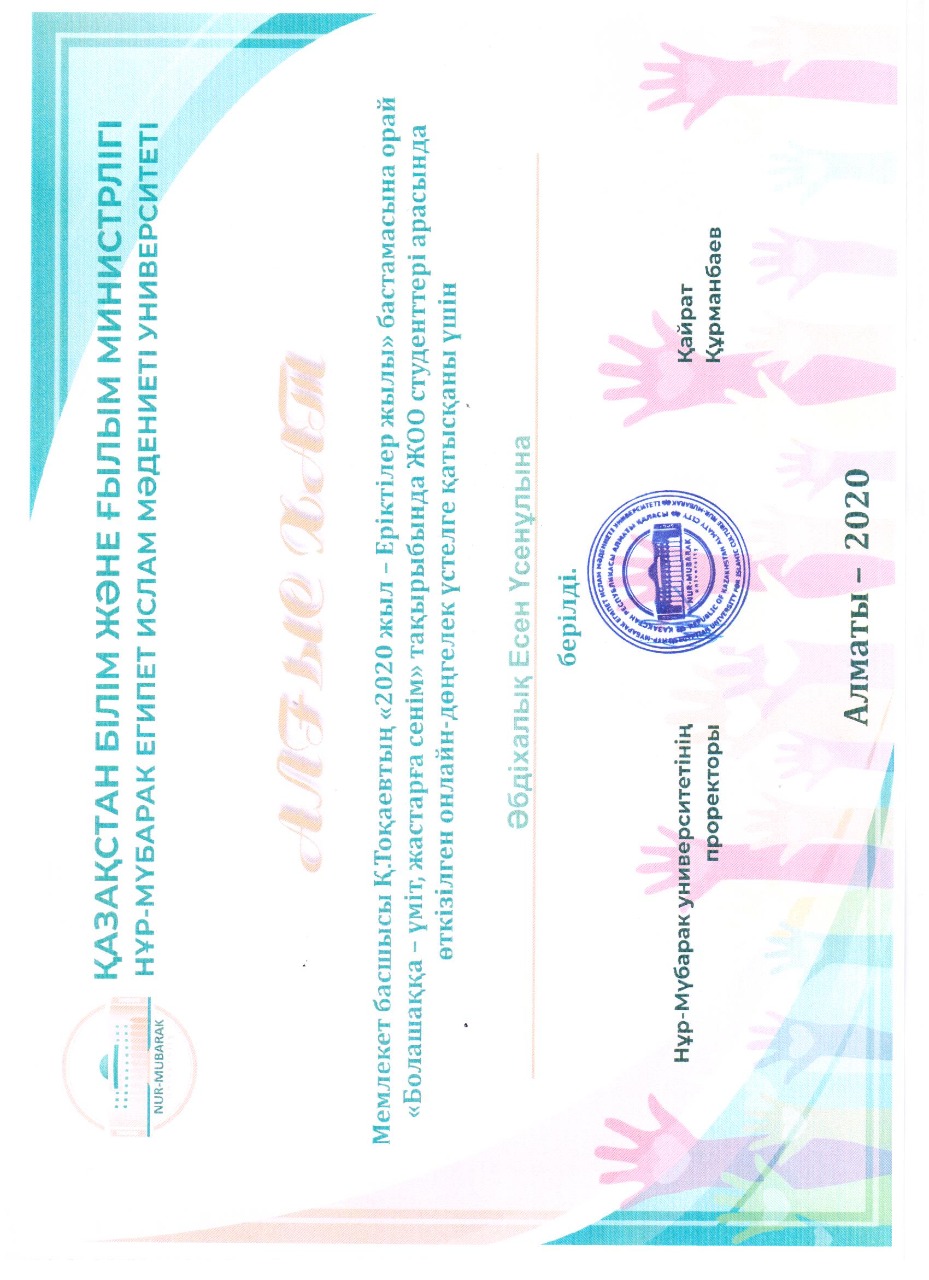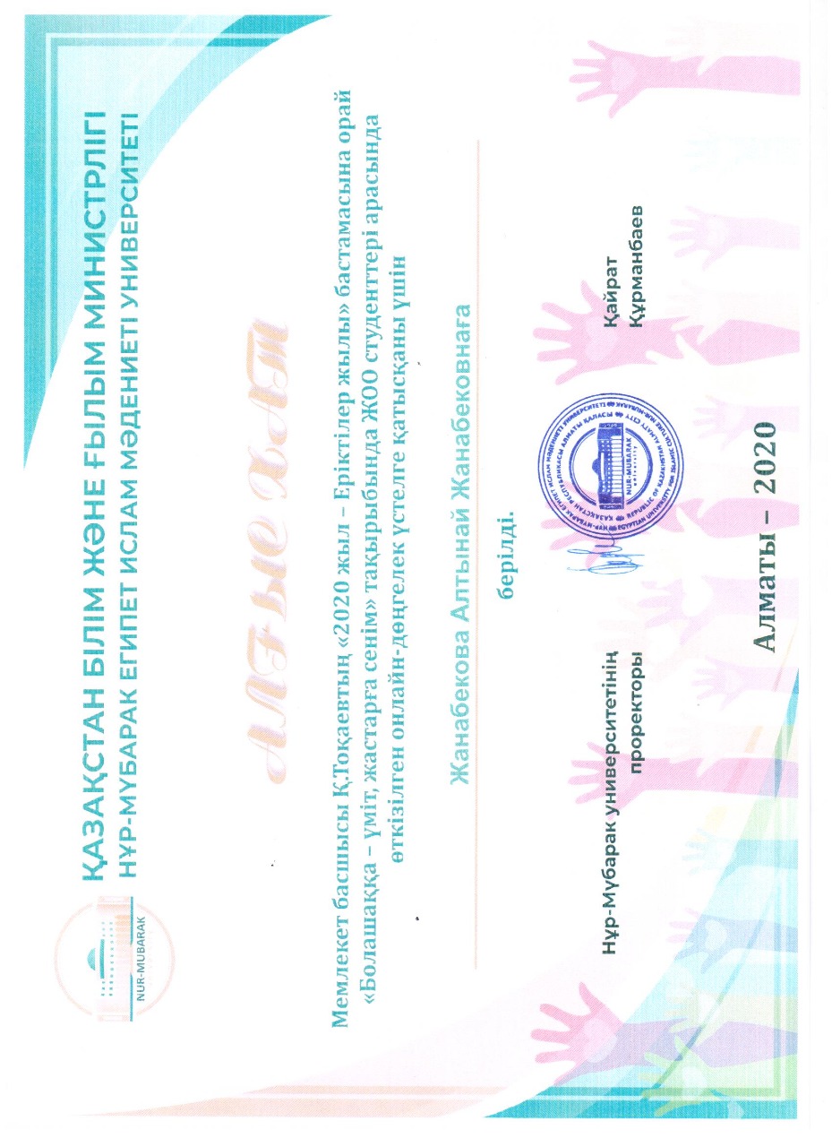 "ЛУЧШИЙ ПРЕПОДАВАТЕЛЬ ВУЗА – 2020" года. Преподователь кафедры информатики кандидат К.Ф.М.Н. Кабдрахова Сымбат Сейсенбековна