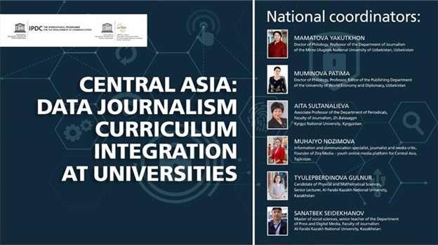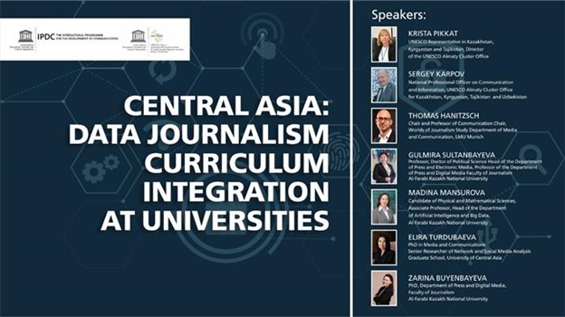 С 5 мая 2021 г. началась серия вебинаров в Центральной Азии нацеленная на качество образования в области журналистики данных. Вовлеченные в проект 19 ВУЗов будут интегрировать учебную программу ЮНЕСКО на вебинарах 5, 12, 19 и 26 мая 2021 гг. Вебинары, организованы кафедрой ЮНЕСКО по журналистике и коммуникациям Казахского национального университета имени аль-Фараби при поддержке Глобальной инициативы МПРК по передовому опыту в области журналистского образования и Бюро ЮНЕСКО в Алматы. 55 университетам журналистики в Центральной Азии необходимы учебные программы ЮНЕСКО по журналистскому образованию, включая 30 университетов в Казахстане, 10 в Кыргызстане 8 в Таджикистане и 7 Узбекистане. В работе журналистов из Центральной Азии журналистика данных стала эффективным инструментом для использования интерактивных графиков и визуального контента.