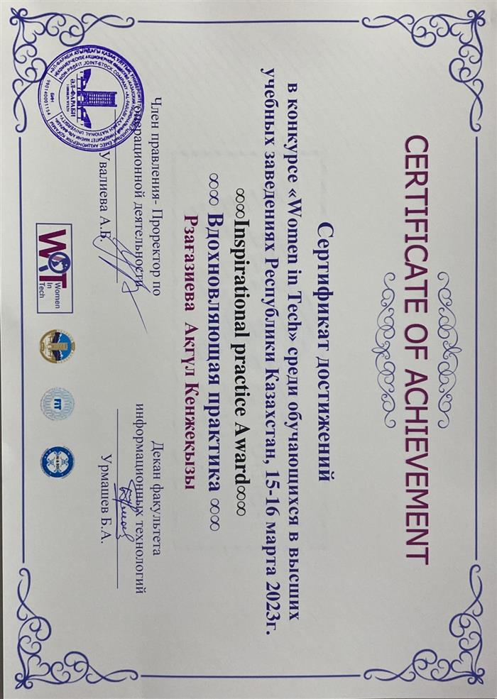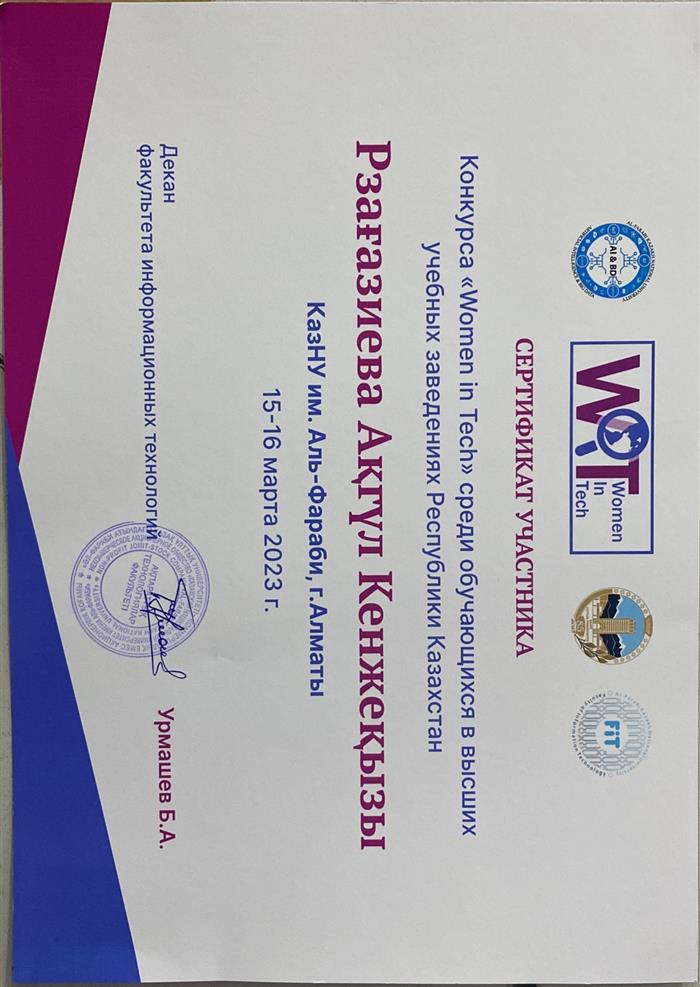 По итогам трех отборочных туров Поздравляем нашу магистрантку 1 курса вычислительная лингвистика-Рзагазиеву Акгуль в участии в респуб. Конкурсе "Woman in tech" и сертификатом в наминации "Вдохновляеющая практика".