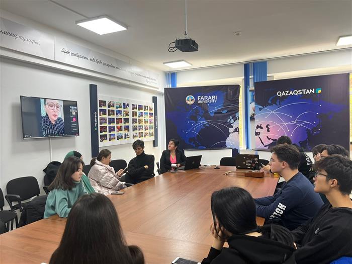 Выпускающий редактор телеканала "Хабар 24" Акерке Абдуалиева провела онлайн-конференцию студентам первого курса на тему “Основа журналистики”