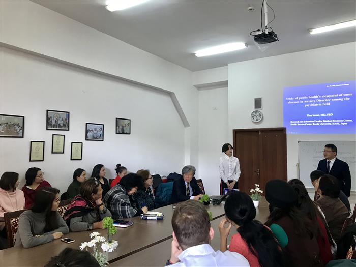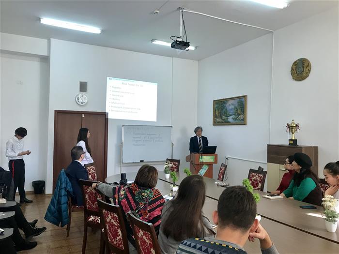 В рамках сотрудничества Казахского Национального Университета имени Аль-Фараби с университетами Kochi University (Япония) и Shimane University (Япония) 5 ноября 2018 года на факультете медицины и здравоохранения была проведена лекция профессора университета Кочи, Япония, MD, PhD Ken Inoue и профессора университета Шиманэ, Япония, MD, PhD Yoshihiro Noso. Профессор Ken Inoue рассказал о результатах исследования тревожного невроза психиатрической наклонности в Японии с точки зрения общественного здравоохранения. Тревожный невроз диагностируется у 5% населения, при этом, чаще развивается в молодом возрасте от 18 до 40 лет и у женщин чаще, чем у мужчин. Тревожный невроз нужно рассматривать как общемедицинскую проблему, так как такие состояния способствуют утяжелению течения соматических заболеваний. Профессор Yoshihiro Noso выступил с лекцией «Хирургия и общая медицина», рассказав о передовых направлениях профилактики хирургических инфекций в медицине. Присутствовавшие преподаватели и обучающиеся задавали интересующие вопросы.