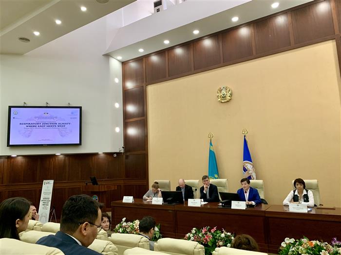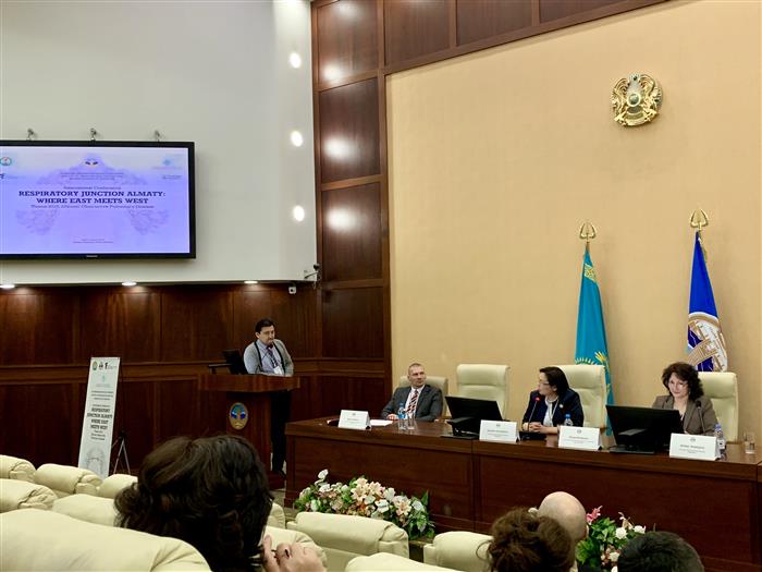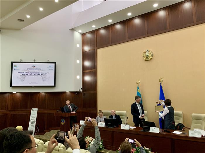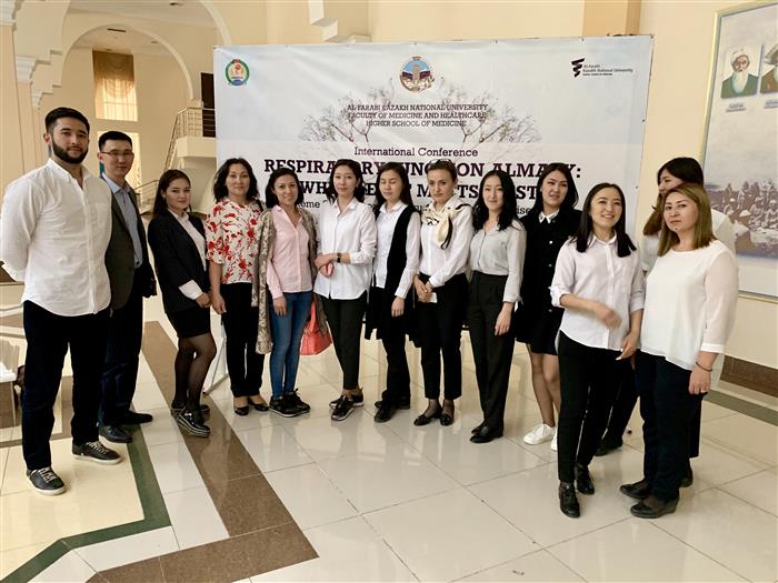 2-3 апреля 2019 г. Магистранты научно- педагогического направления 1 курса факультета медицины и здравоохранения Казахского Национального университета им. Аль-Фараби с куратором- старшим преподавателем кафедры эпидемиологии, биостатистики и доказательной медицины Кузиевой Г.Д. участвовали в международной конференции «RESPIRATORY JUNCTION ALMATY: WHERE EAST MEETS WEST», организованной Факультетом медицины и здравоохранения Казахского Национального университета им. Аль-Фараби, в рамках ежегодного форума «VI международные Фарабийские чтения». Целью конференции являлся двухсторонний трансфер знаний между ведущими экспертами Востока и Запада по наиболее актуальным пульмонологическим заболевания. Были представлены доклады ведущих зарубежных и казахстанских специалистов: Клаус Фогельмайер- Профессор, Председатель Научного Комитета Глобальной Инициативы по ХОБЛ (Германия); Нурлан Даулетбаев - MD PhD , врач - исследователь , пульмонолог, специалист по персонализированной Медицине, Профессор Факультета Медицины , Университет МакГилл (Канада); Бримкулов Нурлан Нургазиевич - д.м.н., профессор, Киргизская государственная медицинская академия им И.К.Ахунбаева (Киргизия); Сыдыкова Салима Жумабаевна - к.м.н., ассистент кафедры семейной медицины постдипломного обучения КГМА им И.К. Ахунбаева (Киргизия); Муминов Талгат Аширович- президента Академии клинической и фундаментальной медицины РК, академик НАН РК, д.м.н.; Нурпеисов Таир Темирланович - д.м.н., профессор , главный аллерголог г. Алматы, руководитель РАЦ; Нугманова Дамиля Сакеновна - д.м.н., профессор, Президент Ассоциации семейных врачей Казахстана.