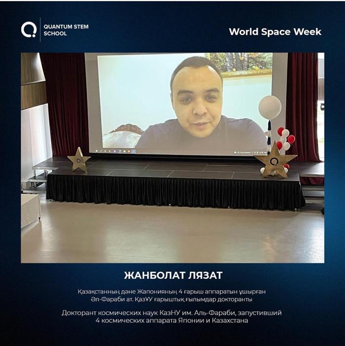 Первое мероприятие на космическую тематику состоялось 7 октября в Quantum STEM School в честь Всемирной недели космоса, которая проходит ежегодно с 4 по 10 октября. В качестве гостей были приглашены лучшие представители казахстанской космической отрасли. В частности, старший преподаватель Казахского национального университета имени аль-Фараби Лязат Жанболат Тулендыулы поделился со студентами своей карьерой по данному направлению и призвал их заниматься наукой и вносить свой вклад в развитие космической отрасли Казахстана.