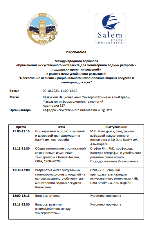 08.10.2023Приглашаем преподавателей и студентов на Международный воркшоп «Применение искусственного интеллекта для мониторинга водных ресурсов и поддержки принятия решений» в рамках Цели устойчивого развития 6: "Обеспечение наличия и рационального использования водных ресурсов и санитарии для всех"