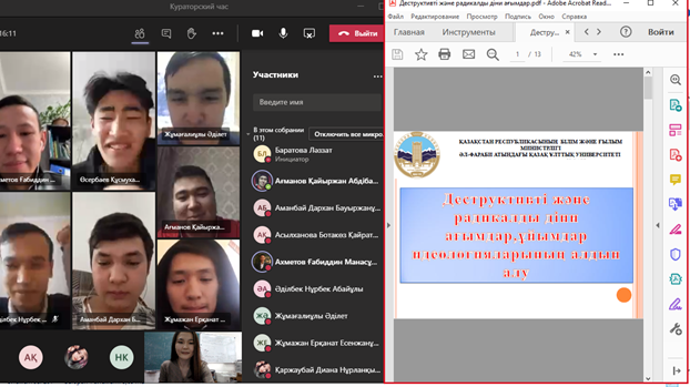 Эдвайзер кафедры Баратова Ляззат Махамбетовна провела открытый кураторский час со студентами 3 курса специальности Автоматизация и управление на тему «Экстремизм. Битва за душу и разум». 30.12.2020 Подробнее >>