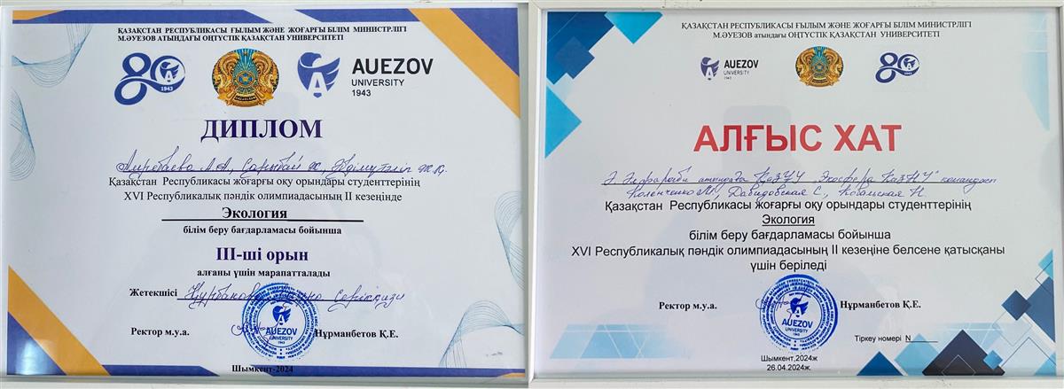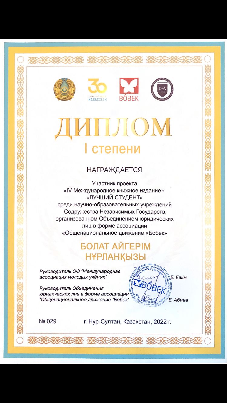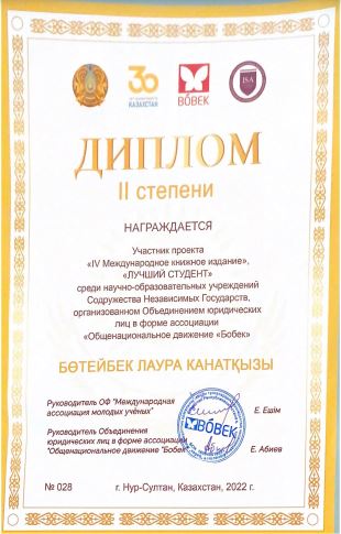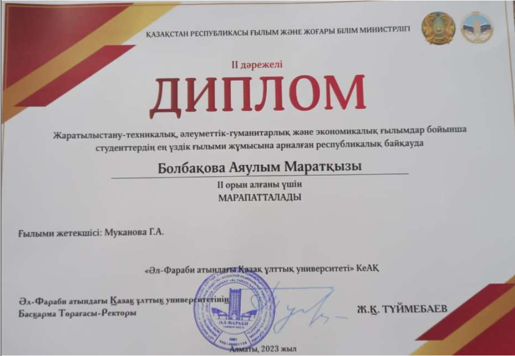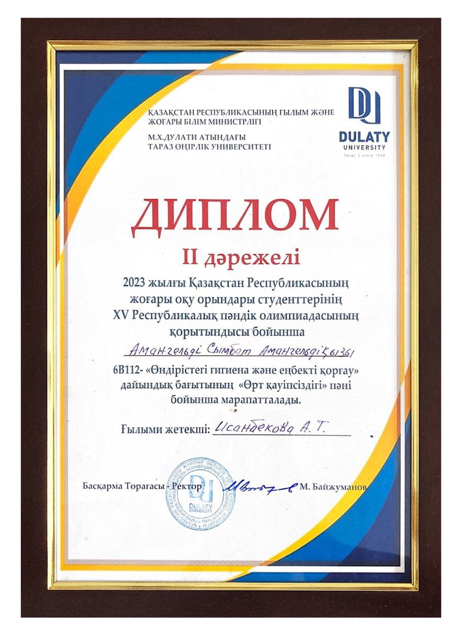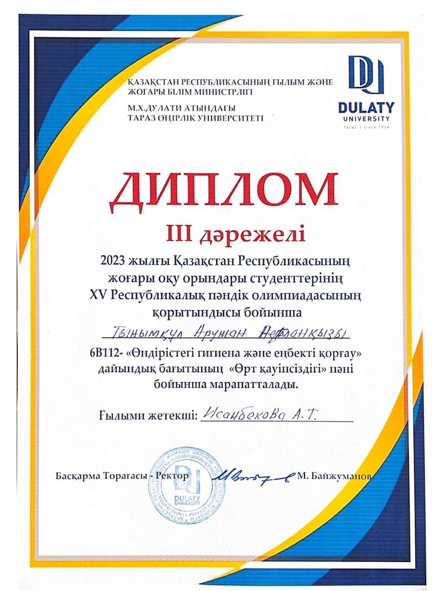 СТУДЕНТКА 3 КУРСА СПЕЦИАЛЬНОСТИ 6В112– «БЕЗОПАСНОСТЬ ЖИЗНЕДЕЯТЕЛЬНОСТИ И ЗАЩИТА ОКРУЖАЮЩЕЙ СРЕДЫ» ТЫНЫМҚҰЛ АРУЖАН ЗАНЯЛА IIІ МЕСТО В XV РЕСПУБЛИКАНСКОЙ ПРЕДМЕТНОЙ ОЛИМПИАДЕ ПО ДИСЦИПЛИНЕ «ПОЖАРНАЯ БЕЗОПАСНОСТЬ» 21.04.2023 Подробнее >>