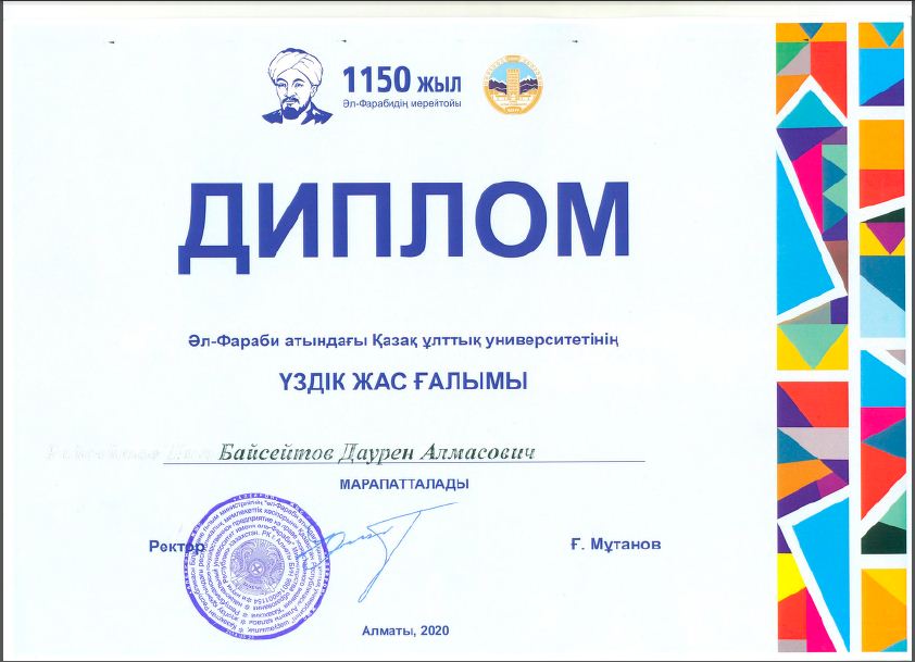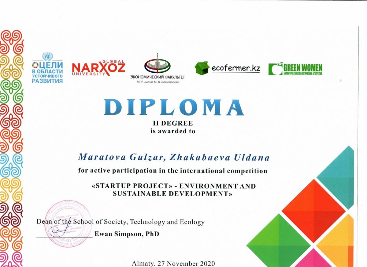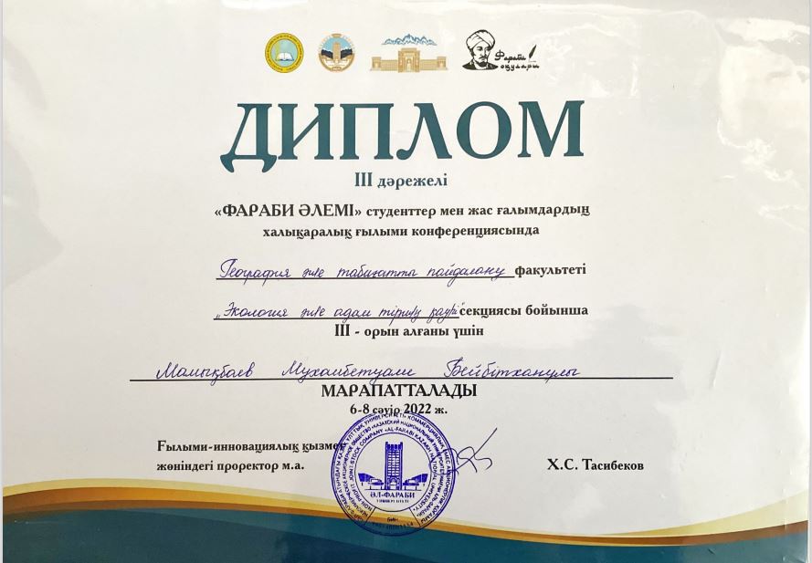 Магистрант 1 курса кафедры ЮНЕСКО по устойчивому развитию Мусакулова Миргуль приняла участие в Международной научно-практической конференция «Сатпаевские чтения – 2021» и получила диплом за I место 22.04.2021 Подробнее >>