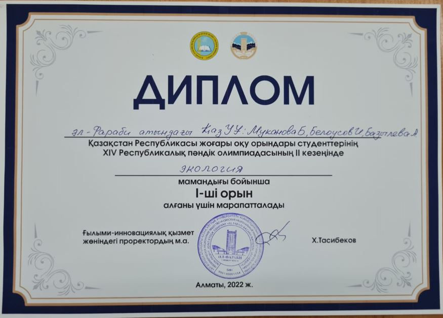 Студентка 3 курса специальности 5B073100 – «Безопасность жизнедеятельности и защита окружающей среды» Бөтейбек Лаура заняла III место в ХІІІ Республиканской предметной олимпиаде 15.04.2021 Подробнее >>