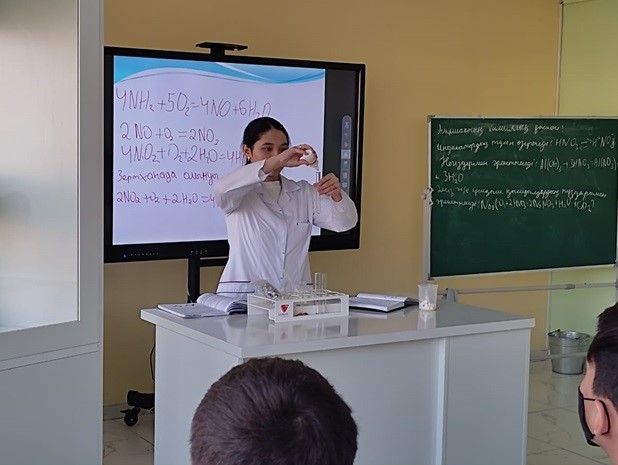 10 марта 2022 года в средней школе №235 г. Кызылорда Турганбек Балнур провела урок по химии на тему «Азотные удобрения», где показала учащимся интересные опыты.