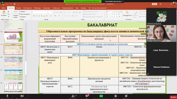 На факультете химии и химической технологии в рамках профориентации прошла онлайн-встреча со студентами Алматы «В светлое будущее вместе с КазНУ». Во встрече приняли участие специализированная гимназия №12 им. Ш. Валиханова, школа-гимназия №130 им. И. Жансугурова, Специализированный лицей № 292 имени Махатмы Ганди, школа-гимназия №5, общеобразовательная школа-интернат № 17, республиканская школа-интернат для одаренных детей им. Абая , гимназия №25, Республиканская физико-математическая школа. Студенты были ознакомлены со структурой факультета, специальностями, а также пороговым баллом, необходимым для поступления на факультет. Кроме того, студенты получили ответы на заданные вопросы.