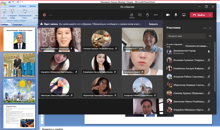 28 ноября 2020 года в 12:00 в кафедре «биоразнообразия и биоресурсов» студенты 3-го курса Научный биологии, проводили открытый урок на тему «1- декабря день первого Президента». В ходе открытого урока студенты познакомились с ценными сведениями о жизни и деятельности нашего президента. Студенты обменялись мнениями, и в конце нашего открытого урока студентам было задано несколько вопросов,на которые студенты ответили.