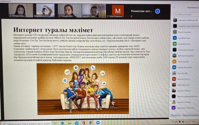 3 декабря 2020 года в кафедре «Биоразнообразия и биоресурсов» куратор-эдвайзер: Зорбекова А.Н и студенты 1 курса «6В05102 Биология» провели открытый воспитательный онлайн урок на тему: «ИНТЕРНЕТ -ПОЛЬЗА и ВРЕД». На уроке поднимались важные темы касательно о влияние интернета на здоровье человека, а ребенка в особенности. Студенты разделились на две группы и 1 группа доказали что интернет и компьютерные технологии приносять пользу, а 2 группа доказали что интернет и информационные технологии не только полезные, но и вредные. Студенты закрепили понятия, как «каковы правили общения в сети, какие операции мы можем произвести при помощи компьютеров» и.т. Студенты обсуждали и высказывали свои мнения по вопросу: сетевого этикета, и именно, прежде всего нельзя делать тех вещей, которые не поощряются в любом цивилизованном обществе: употреблять ненармативную лекцику, разжигать национальную рознь, оскорблять людей и.т. В конце воспитательного урока были сделаны выводы, как мы должны или в каких ситуациах нужно воспользоваться интернетом и при этом не забыть про сетевого этикета.
