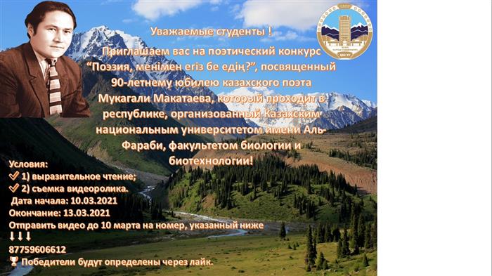 Приглашаем вас на поэтический конкурс “Поэзия, менімен егіз бе едің?”, посвященный 90-летнему юбилею казахского поэта Мукагали Макатаева, который проходит в республике, организованный Казахским национальным университетом имени Аль-Фараби, факультетом биологии и биотехнологии!
