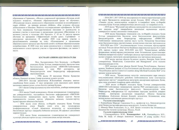 Докторант 1 курса и преподаватель кафедры биоразнообразия и биоресурсов, факультета биологии и биотехнологии Казахского национального университета имени аль-Фараби, Құсманғазинов Әділ Болатұлы награжден нагрудным знаком «Лучший молодой ученый СНГ – 2021» и благодарственным письмом на международной конференции «Образование и наука XXI века», организованной Международным центром спорта, образования и науки «Genius» за участие в проекте "Лучший молодой ученый среди молодежи СНГ". В сборник книги молодых ученых СНГ, вошла автобиография молодого ученого. Научный руководитель заведующая кафедрой биоразнообразия и биоресурсов д.б.н., профессор Курманбаева Меруерт Сакеновна. От имени кафедры поздравляем молодого ученого и научного руководителя желаем новых творческих идей и высоких профессиональных достижений!
