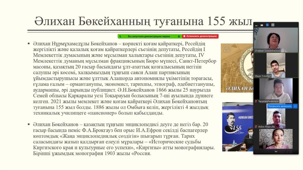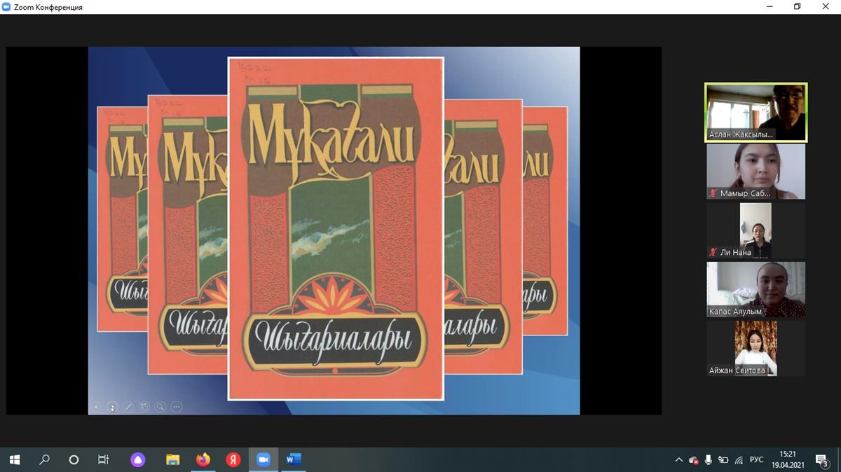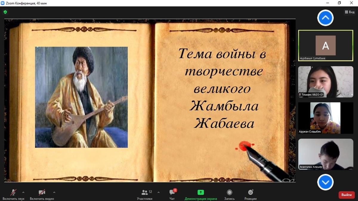 19.04.202119 апреля 2021 года в Аль – Фараби КазНУ, филологическом факультете, кафедре иностранных языков: доцент, к.ф.н. У.Б. Адилбаева, старший преподаватель Гайипова Г.А., старший преподаватель КазНПУ им.Абая Артыкова Е.У организовали мероприятие "Мы - потомки героев" со студентами первого курса факультета «Информационные технологии» КазНУ совместно со студентами КазНПУ им.Абая.