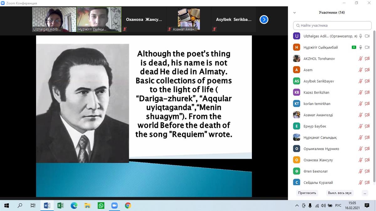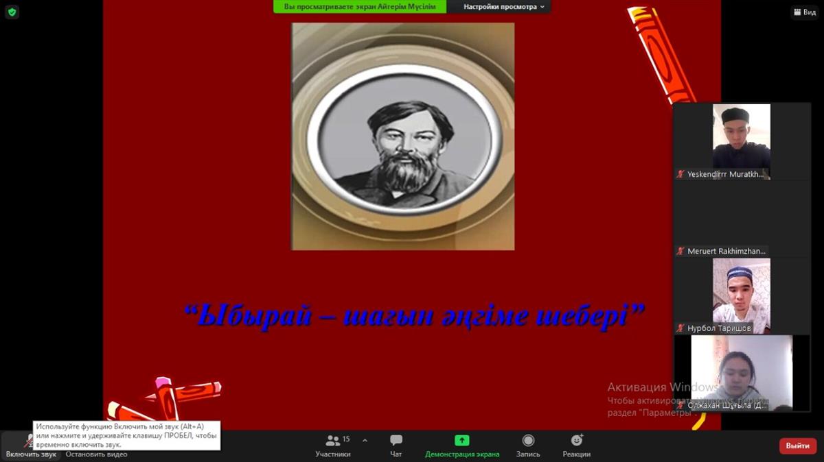 17.03.202117 марта 2021 года, старший преподаватель кафедры иностранных языков, кандидат филологических наук, доцент, Айсултанова К.А. провела открытый урок, посвященный 90-летию известного Казахстанского поэта Мукагали Макатаева на платформе ZOOM со студентами первого курса.