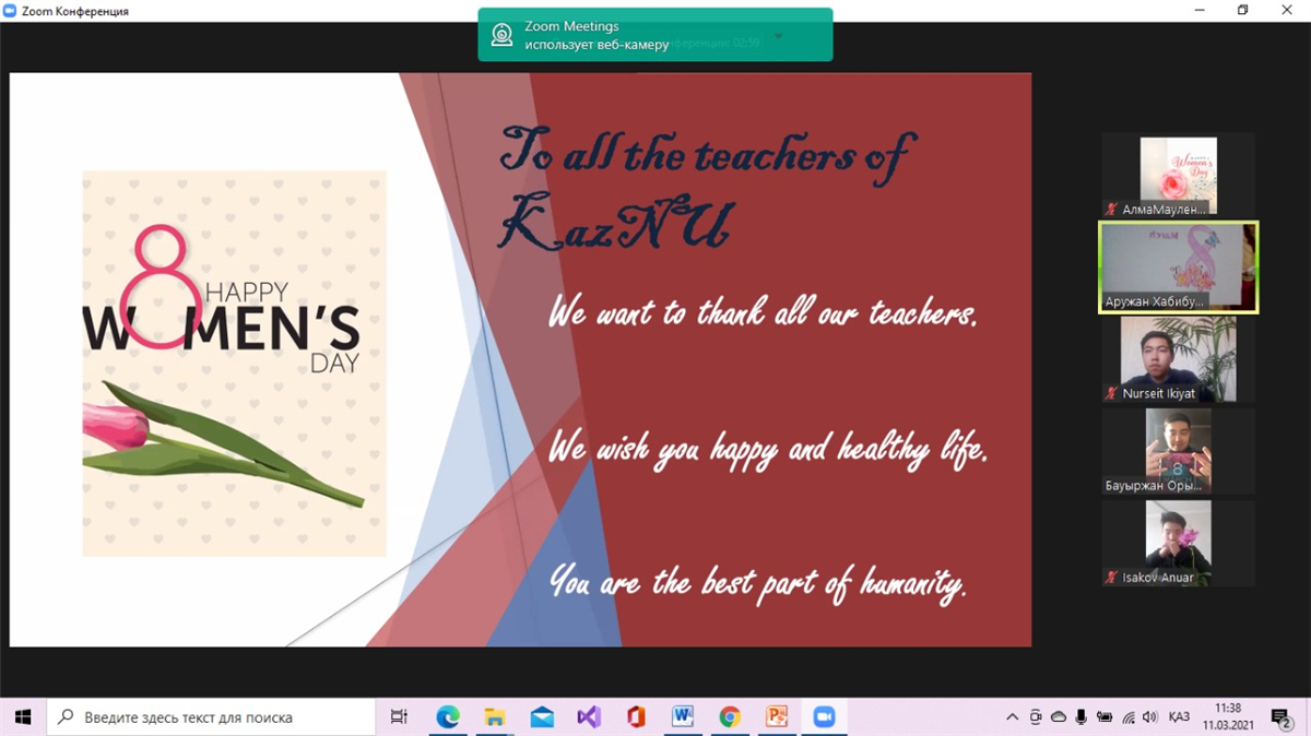 07.03.2021В соответствии с планом воспитательной работы университета 7 марта 2021 года преподаватели кафедры иностранныхх языков Адилбаева У. Б и Гайипова Г. А провели праздничное мероприятие, посвященное празднику весны, 8 Марта со студентами факультета информационных технологий.