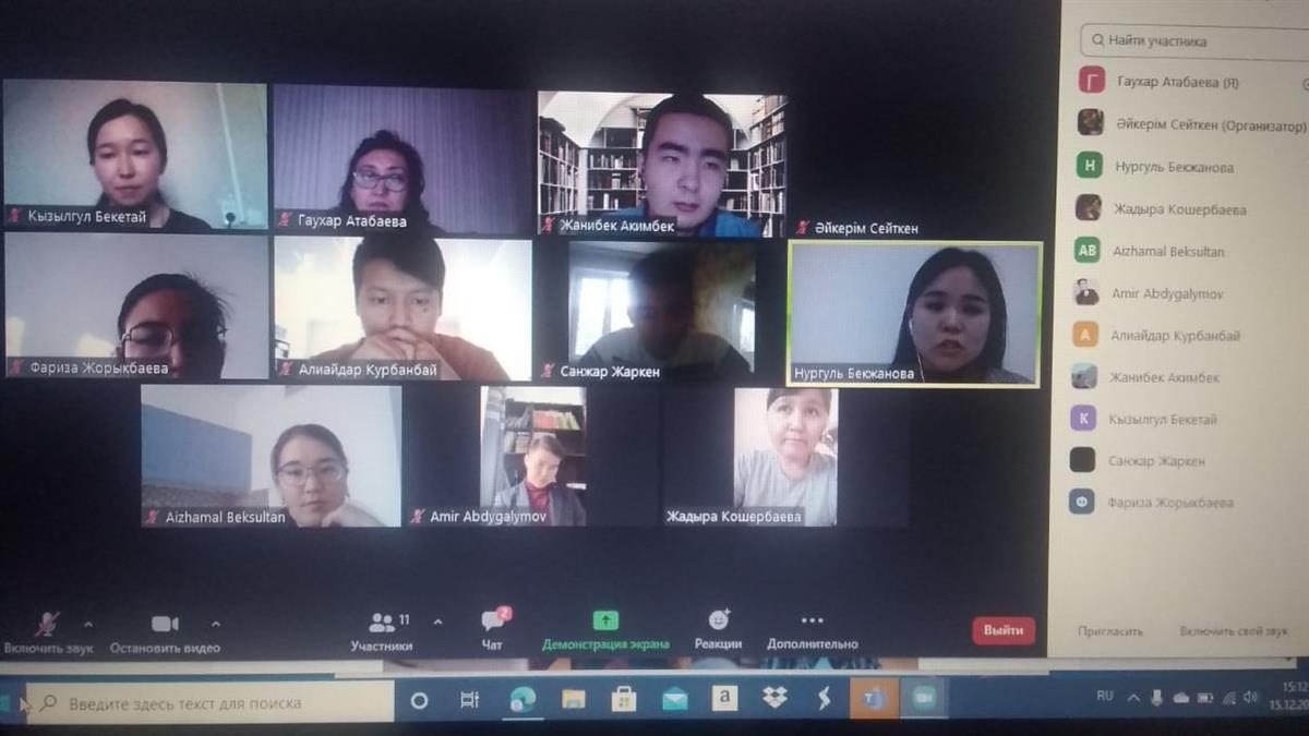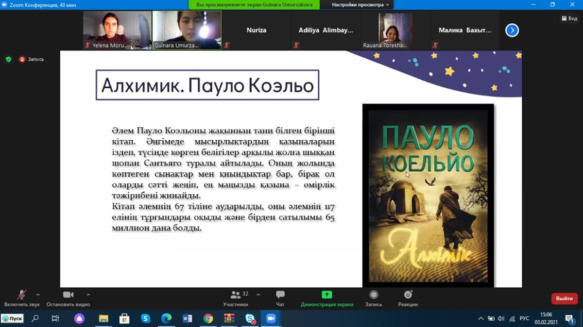 1 февраля, 2021 года состоялась очередное 5-ое заседание Клуба любителей английских песен на онлайн-платформе ZOOM. Мероприятие организовали руководители клуба, старшие преподаватели кафедры иностранных языков факультета филологии имировых языков - Мусанова Г.А. и Оразаева Г.А. Тема мероприятия: «Популярные Британские хиты». В мероприятии приняли участие студенты 1-го курса (101, 102, 103, 104, 107 группы) юридического факультета казахского отделения, обучающиеся по специальностям «Юриспруденция» и «Правоохранительная деятельность».