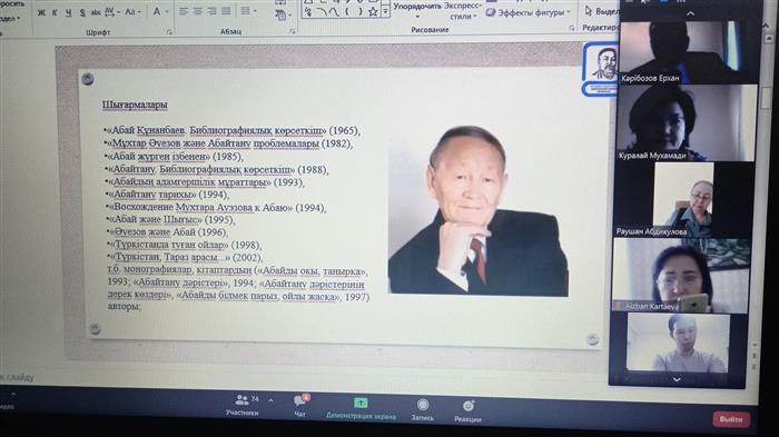 27 ноября 2020 года на платформе ZOOM проходила международная конференция на тему: Духовное наследие Абая и Аль-Фараби: их место и значение в современной цивилизации. Конференция была организована кафедрой казахской литературы и теории литературы факультета филологии и мировых языков. В качестве модератора конференции выступила кандидат филологических наук Л. Мусалы. В конференции приняли участие известные ученые филологи Казахстана, Турции, Узбекистана и Кыргызстана. В ходе конференции состоялась презентация новых книг, посвященных жизни и работе великих мыслителей Казахской культуры: Абая Кунанабаева и Абу Насра Аль-Фараби.