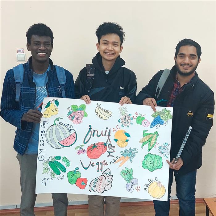 Студенты обсудили содержание данной цели и выполнили интерактивные задания. Вводная часть занятиябыла посвящена видеоматериалу о таких проблемах, как всеобщий доступ к качественным медицинским услугам, опасения по поводу материнской и неонатальной смертности, доступ к безопасным и недорогим лекарствам и вакцинам для всех, а также важность здорового питания. По итогам занятия, студенты создали постеры "Карта фруктов и овощей" о полезных свойствах и питательных веществах различных фруктов и овощей.