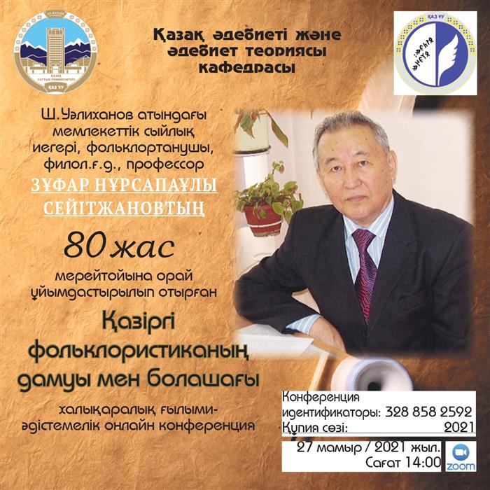 Кафедра казахской литературы и теории литературы приглашает Вас на международную научно-методическую онлайн конференцию, посвященную 80-летеию доктора филологических наук Зуфара Нурсапаулы Сейтжанова.