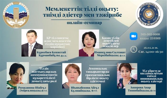 Кафедра казахского языкознания Филологического факультета КазНУ им. аль-Фараби приглашает Вас принять участие 26 февраля 2022 года на онлайн-семинар «ОБУЧЕНИЯ ГОСУДАРСТВЕННОМУ ЯЗЫКУ: ЭФФЕКТИВНЫЕ МЕТОДЫ И ПРАКТИКА».