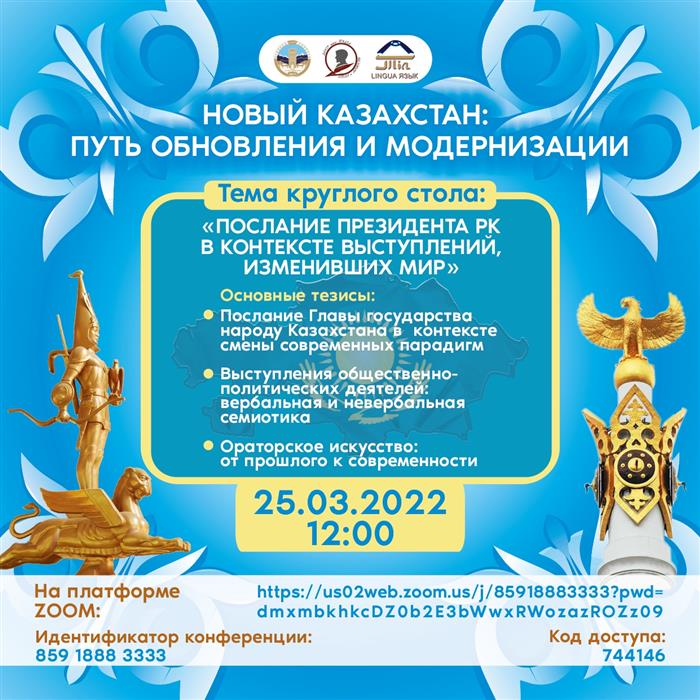 25.02.2022 в 12.00 кафедра русской филологии и мировой литературы проводит круглый стол «ПОСЛАНИЕ ПРЕЗИДЕНТА РК В КОНТЕКСТЕ ВЫСТУПЛЕНИЙ, ИЗМЕНИВШИХ МИР»
