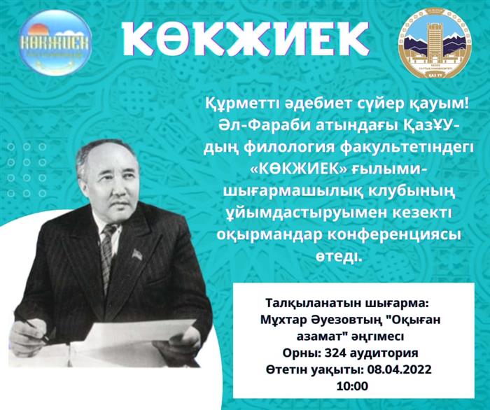 Научно-творческий клуб «КӨКЖИЕК» филологического факультета КазНУ проводит читательскую конференцию по ранним рассказам М.Ауэзова. Конференция посвящается к 125-летию великого писателя М.Ауэзова.