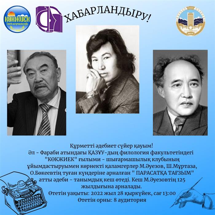 Научно-творческий клуб «КӨКЖИЕК» филологического факультета приглашает на литературно-познавательный вечер «ПАРАСАТҚА ТАҒЗЫМ», посвященный 125-летию М.Ауэзова. Мероприятие проводится по творчеству казахских писателей М.Ауезова, Ш.Муртаза, О.Бокеева.