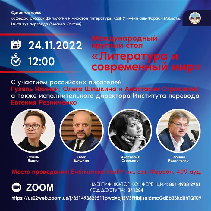 24 ноября 2022 года в 12.00 состоится Международный круглый стол на тему «Литература и современный мир» с участием российских писателей Гузели Яхиной, Олега Шишкина и Анастасии Строкиной, а также исполнительного директора Института перевода Евгения Резниченко.