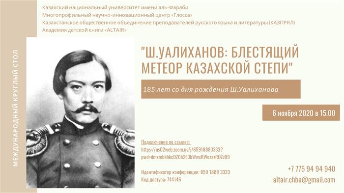 Уважаемые студенты, магистранты и преподаватели ! 6 ноября 2020 года в 15.00 Казахский национальный университет имени аль-Фараби совместно с Многопрофильным научно-инновационным центром «Глосса», Казахстанским общественным объединением преподавателей русского языка и литературы (КАЗПРЯЛ) и Академией детской книги «ALTAIR» проводит онлайн-конференцию, посвященную 185-летию Ш.Уалиханова. Тема конференции: «Ш.УАЛИХАНОВ: БЛЕСТЯЩИЙ МЕТЕОР КАЗАХСКОЙ СТЕПИ». Подключение по ссылке: https://us02web.zoom.us/j/85918883333? pwd=dmxmbkhkcDZ0b2E3bWwxRWozazROZz09 Идентификатор конференции: 859 1888 3333 Код доступа: 744146
