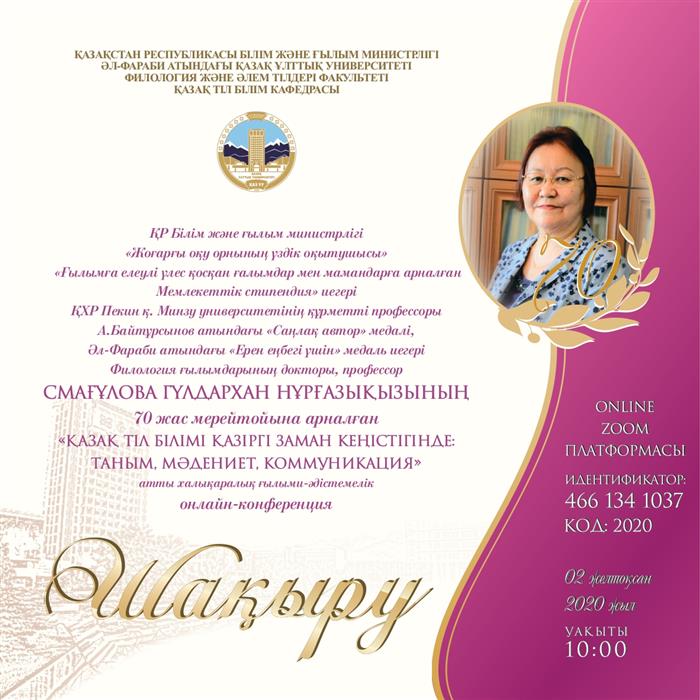2 декабря на платформе ZOOM состоиться юбилейная конференция в честь 70-летия профессора Смагуловой Г.Н. на тему: КАЗАХСКИЙ ЯЗЫК В СОВРЕМЕННОМ ПРОСТРАНСТВЕ: ЗНАНИЯ, КУЛЬТУРА, КОММУНИКАЦИЯ.