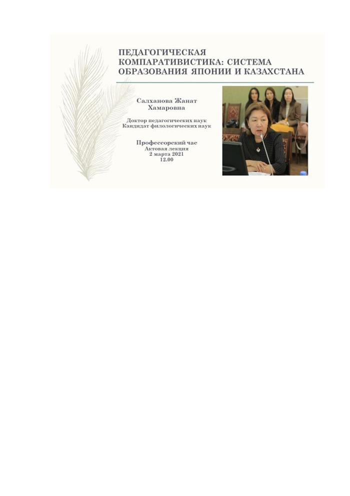 Кафедра русской филологии и мировой литературы факультета филологии и мировых языков приглашает Вас прослушать лекцию профессора Салхановой Жанат Хамаровны. Лекция состоится 2 марта в 12 .00 на платформе ZOOM. Тема лекции: Педагогическая компаративистика: Система образования Японии и Казахстана.