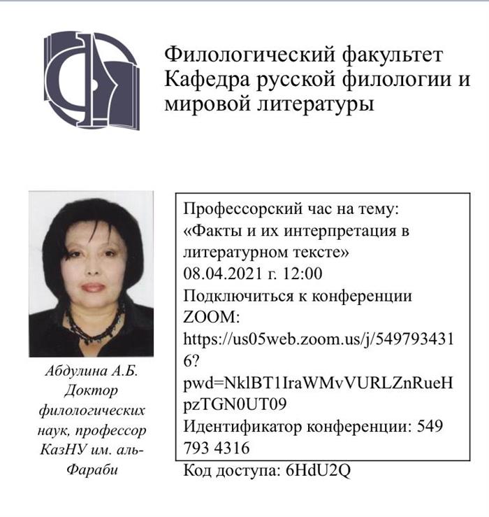 Кафедра русской филологии и мировой литературы приглашает Вас прослушать онлайн лекцию профессора, доктора филологических наук Абдулиной А.Б. на тему: «Факты и их интерпретация в литературном тексте».