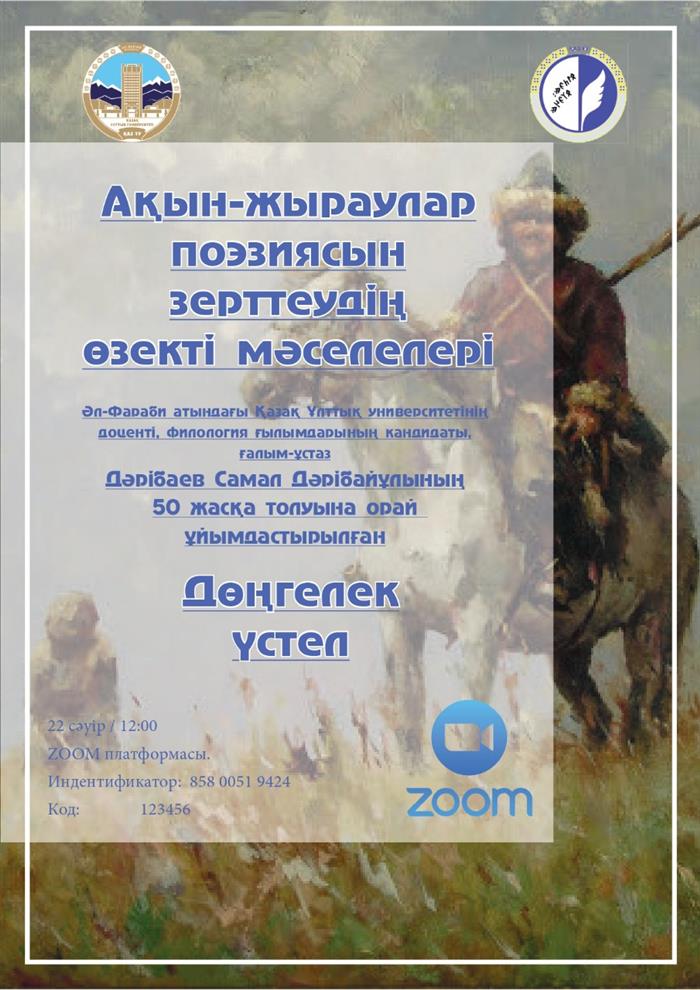 Педагог-ученый, кандидат филологических наук, доцент Дарибаев С.Д. приглашает вас принять участие в онлайн-круглом столе на тему: «Актуальные проблемы изучения поэзии поэтов и поэтесс», посвященном 50-летию Самала Дарибаевича. На круглый стол приглашены отечественные литературоведы, исследователи вузов и научно-исследовательских институтов, магистранты и докторанты.