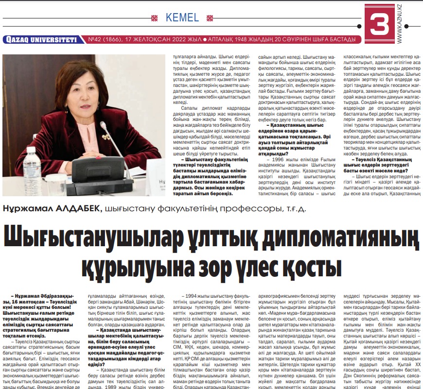 Опубликована статья «Востоковеды внесли значительный вклад в становление национальной дипломатии» 31.01.2023 Подробнее >>