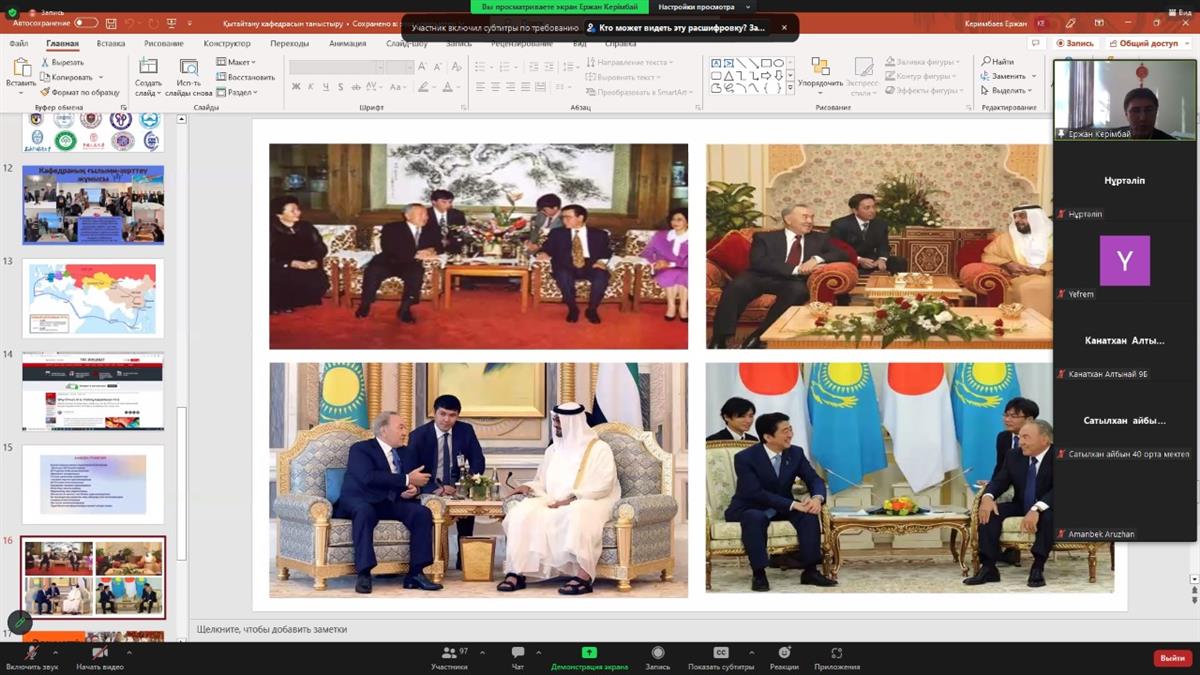 30.12.202228 декабря доцент кафедры китаеведения Сапарбаева Нуржан Балтажановна провела научный семинар о развитии международных отношений Казахского Национального университета им. аль-Фараби на примере Мордовского Государственного научно-исследовательского университета им Н.П. Огорева.
