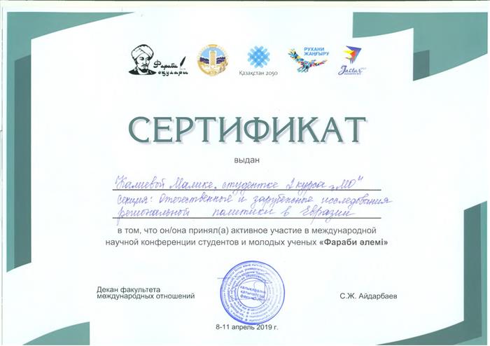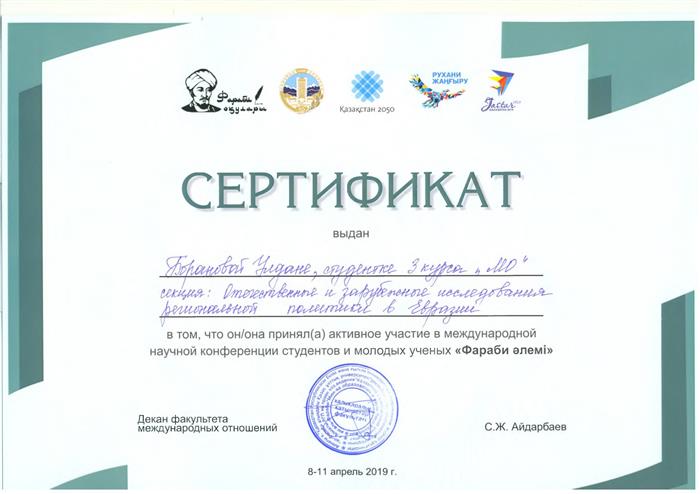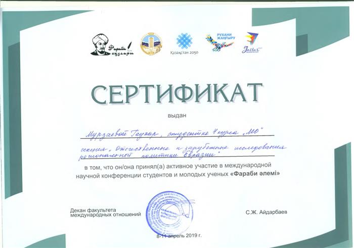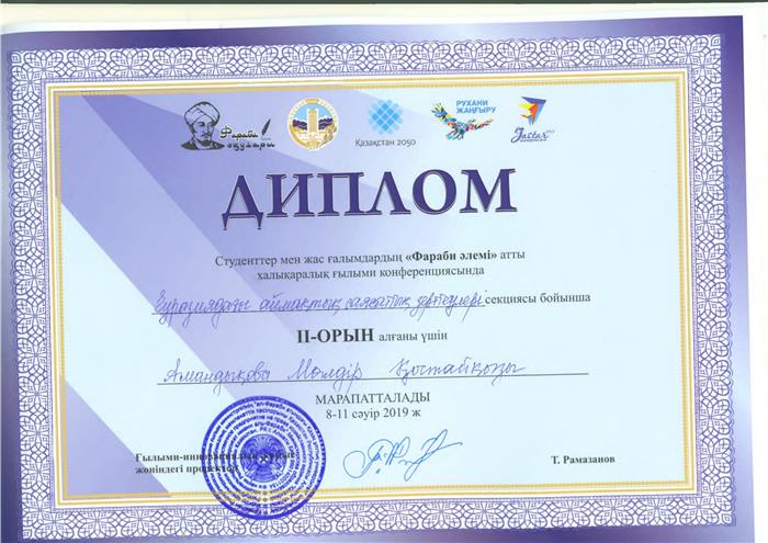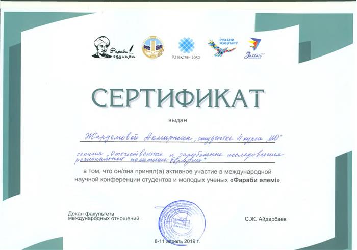 В ходе трехдневной конференции «Фараби әлемі» студенты выступали со своими докладами и научными исследованиями в различных секциях. Большинство докладов было в форме презентаций. Студенты справились со сложными вопросами, участвовали вдискуссии по самым острым вопросам международных и региональных процессов. В заключении всех мероприятий были получены следующие призовые места студентами, обучающиеся на факультете международных отношений, специальности "В020200-Международные отношения "