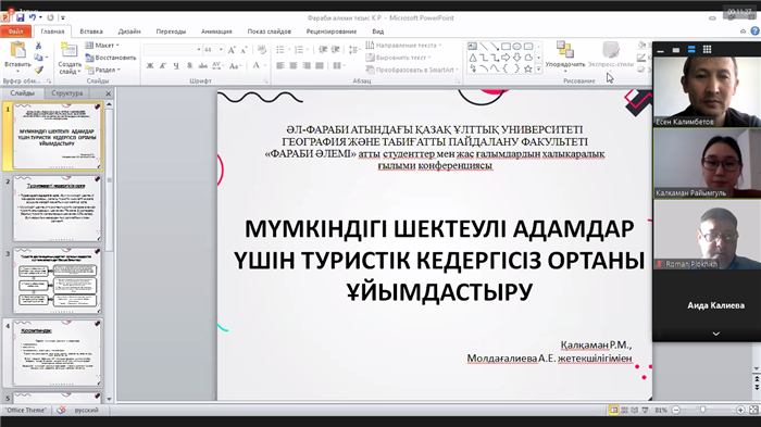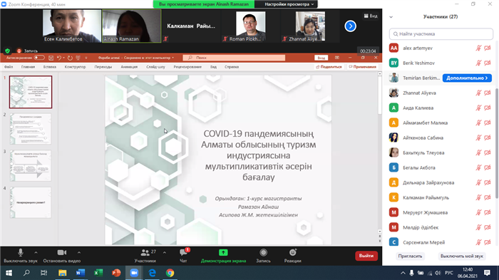6 апреля 2021 г. на факультете географии и природопользования была проведена международная конференция студентов и молодых ученых «Фараби әлемі». В ходе конференции на кафедре рекреационной географии и туризма были заслушаны доклады по следующим секциям:
