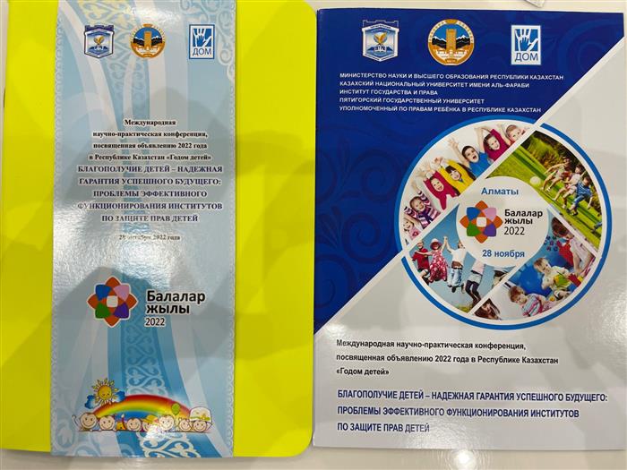 28 октября 2022 г. докторант 1 курса кафедры таможенного, финансового и экологического права Есекеева Айнаш Акимсаловна приняла участие в международной научно-практической конференции “Благополучие детей - надежная гарантия успешного будущего: проблемы эффективного функционирования институтов защиты прав детей” в связи с тем, что 2022 год в Республике Казахстан назван “годом детей”.