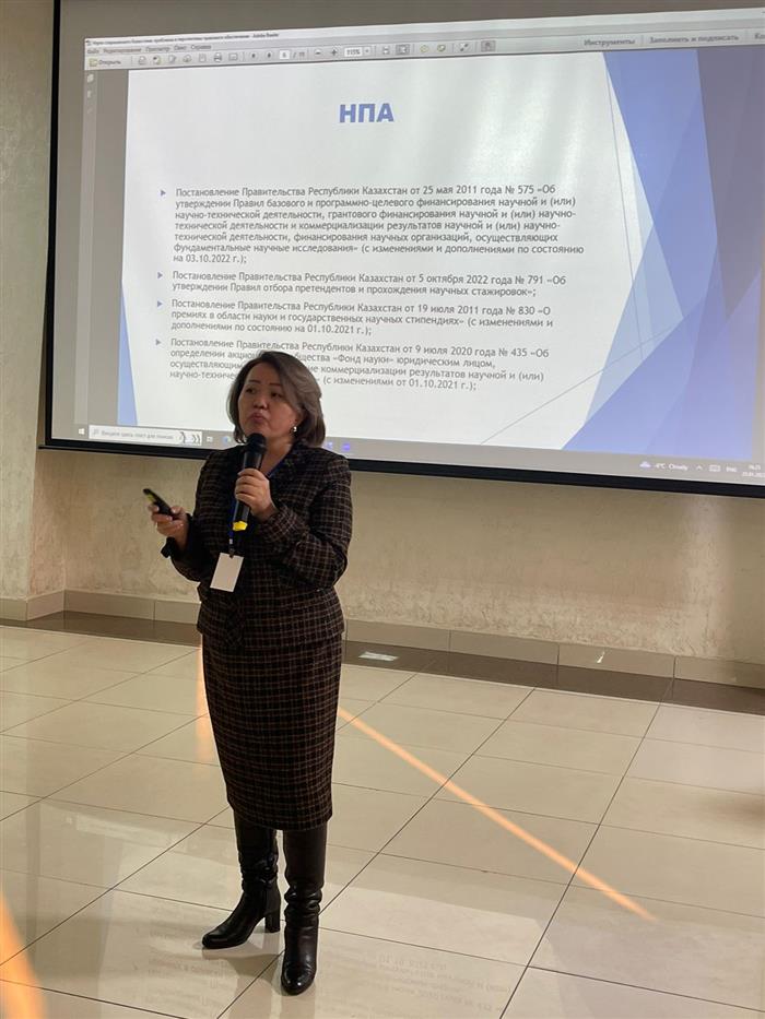 В ее докладе было отмечено, что главной движущей силой развития науки и инноваций является человек, его интеллектуальные ресурсы. В этой связи, требуется законодательно конкретизировать правовой статус ученых, научных работников, прописать жизненный цикл подготовки данных кадров, систематизировать правовые нормы в области их социальной поддержки. Существующий закон РК «О науке» носит отсылочный характер, он не дает полной картины стимулов, льгот и преференции для разных категорий ученых. Вместе с тем, имеют место случаи, когда подзаконные нормативные акты ущемляют права людей, возраст которых превышает 40 лет. Они лишены права учиться в постдокторантуре, в то время, как по данным статистики РК на их долю приходится более 60 процентов научных работников. Поэтому, предлагается совершенствовать систему постдокторантуры в стране, развивать механизмы поддержки данной возрастной категории.