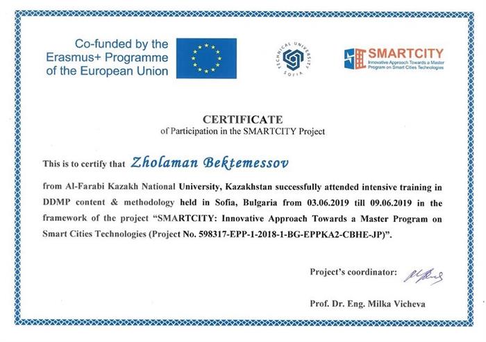 Сертификаты за участие в семинаре проекта SMARTCITY: Инновационный подход к магистерской программе по технологиям умных городов прошедший на базе Софийского Технологического университета с 3.06.2019 по 9.06.2019.