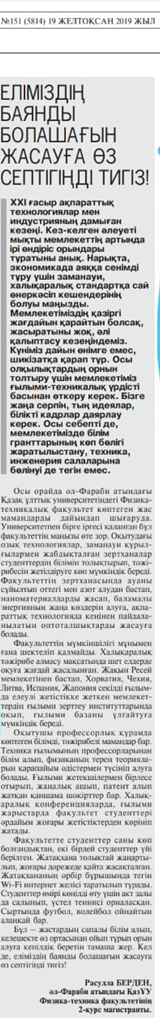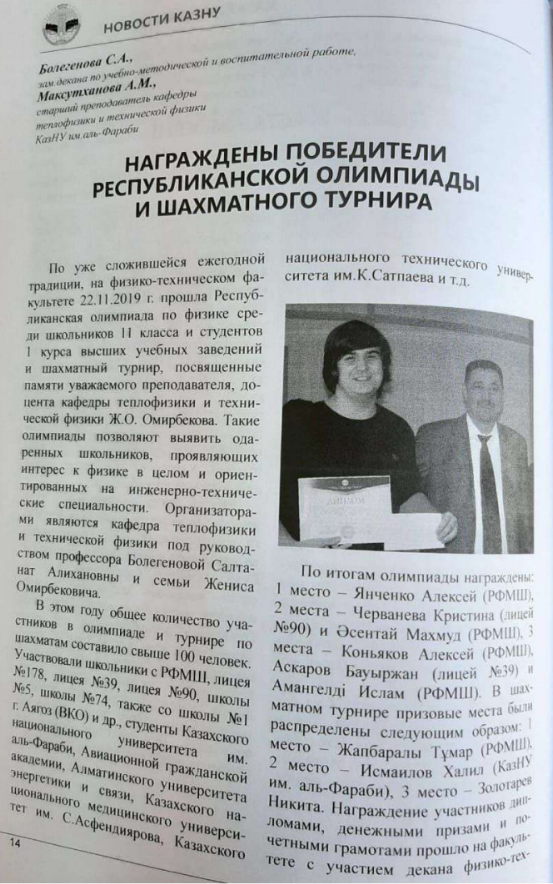 | 5 | «Награждены победители республиканской олимпиады и шахматного турнира» | Al-Farabi.kz | №4/2019 |