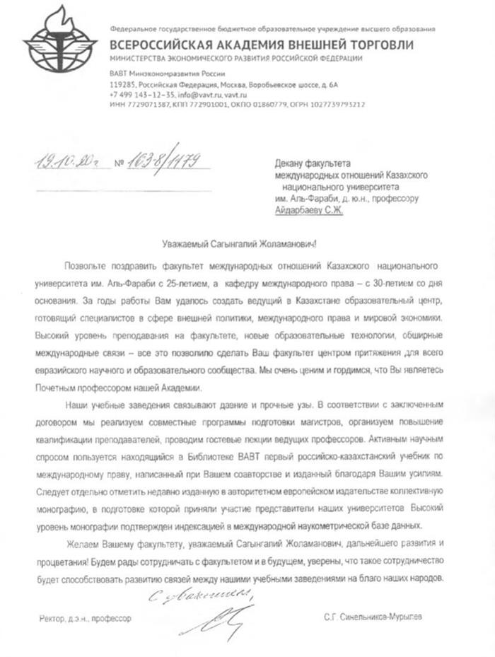 Поздравление от Всероссийской академии внешней торговли