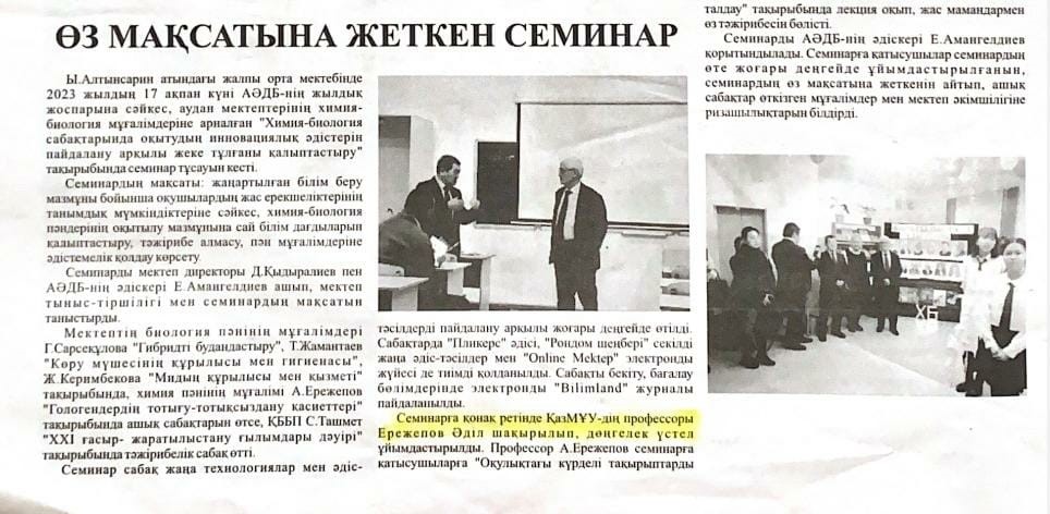 Статья посвящена работе семинара организованного отделом образования Тюлкубасского района Туркестанской области, в котором по их приглашению принял участие доцент кафедры биотехнологии КазНУ имени аль-Фараби Ережепов А.Е. с лекцией на тему «Разбор сложных тем» в учебниках биологии и поделился опытом преподавания с молодыми специалистами.