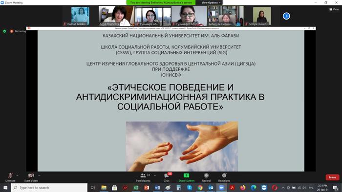 8)20 января 2021 года на базе кафедры социологии и социальной работы начался цикл каскадный сессий «Этическое поведение и антидискриминационная практика в социальной работе» для профессорско-преподавательского состава и молодых специалистов в области социальной работы по учебное программе «Формирование компетенций: межличностное общение и вовлечение сообщества», разработанной Школой социальной работы, Группой социальных интервенций Колумбийского университета, Центром изучения глобального здоровья в ЦА при поддержке ЮНИСЕФ в Казахстане.