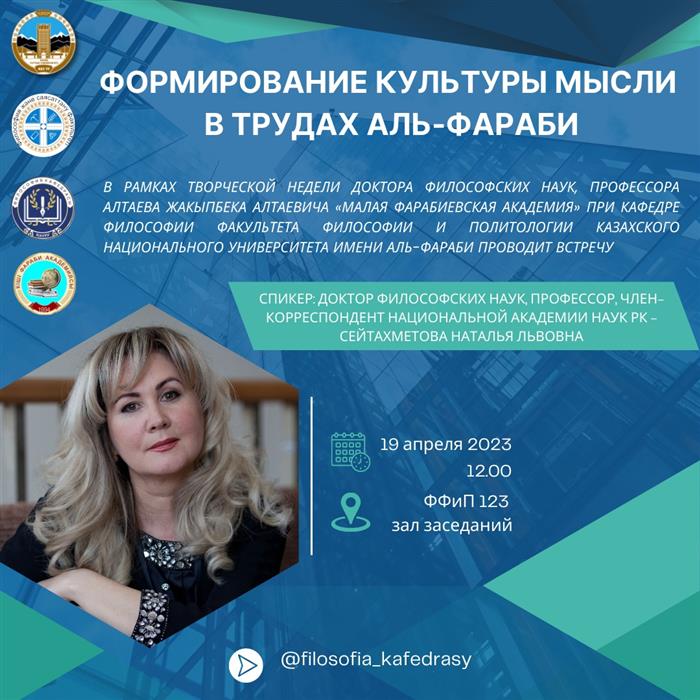 В рамках творческой недели посвященной 75-летию доктора философских наук, профессора Алтаева Жакыпбека Алтаевича «Малая фарабиевская академия» при кафедре философии факультета философии и политологии Казахского национального университета имени аль-Фараби проводит встречу при участии доктора философских наук, профессора, член-корреспондента НАН РК - Сейтахметовой Натальи Львовны на тему "Формирование культуры мысли в трудах аль-Фараби" для изучения наследия великого мыслителя. Встреча состоится 19 апреля в 12:00 в 123 зале заседаний факультета философии и политологии.